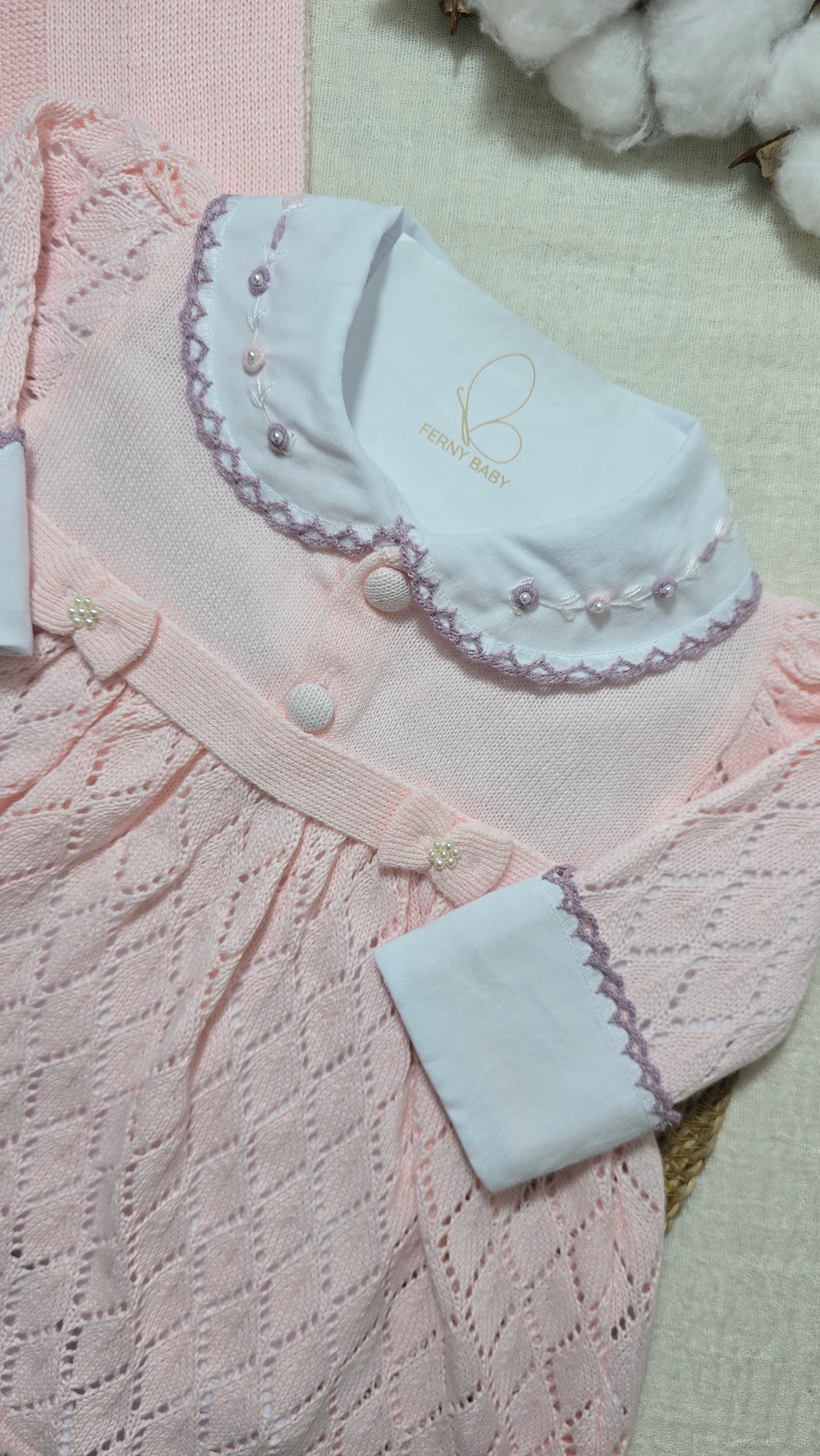 1 body em algodão egípcio, bordado rococó lilás e rosa