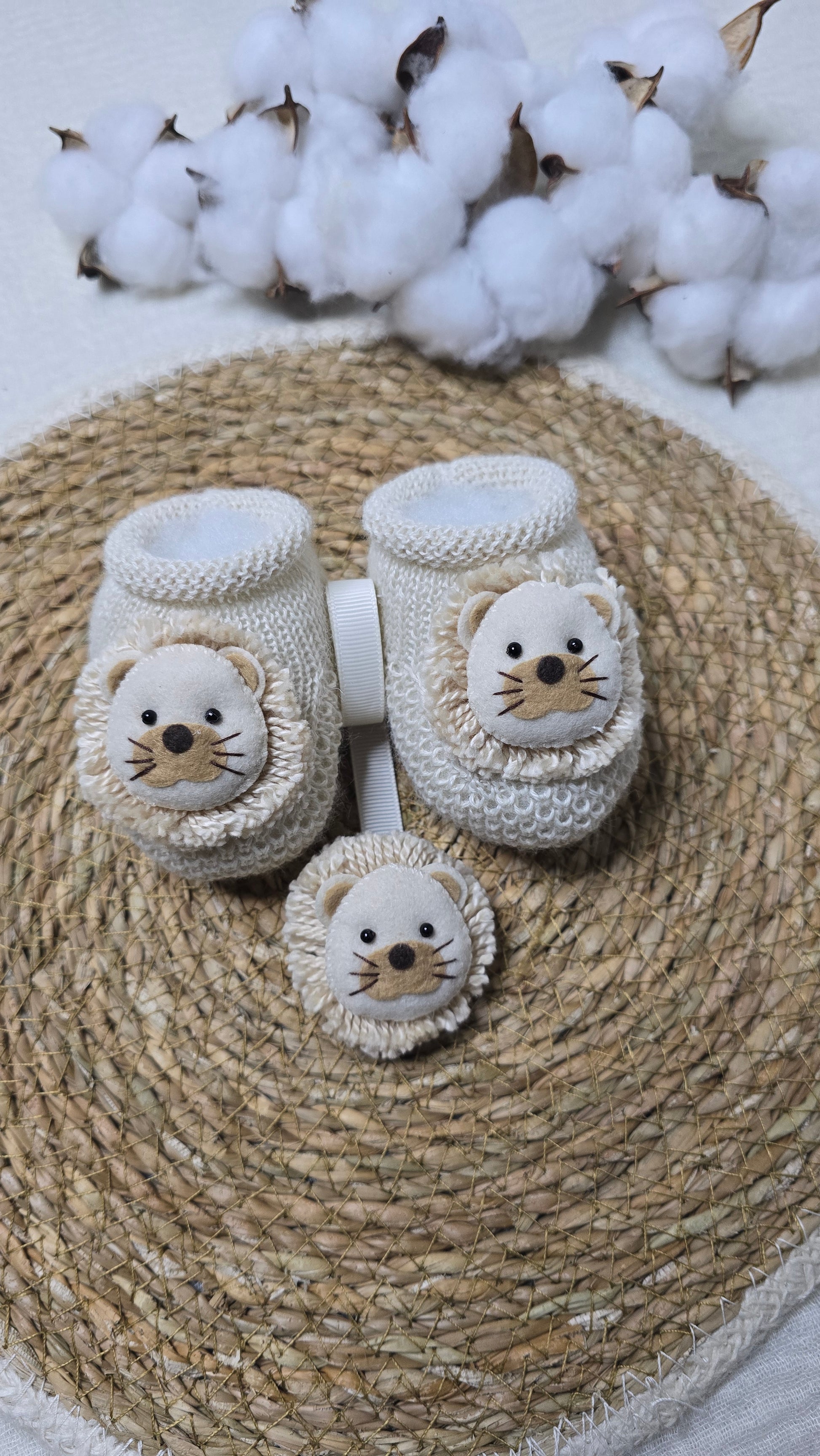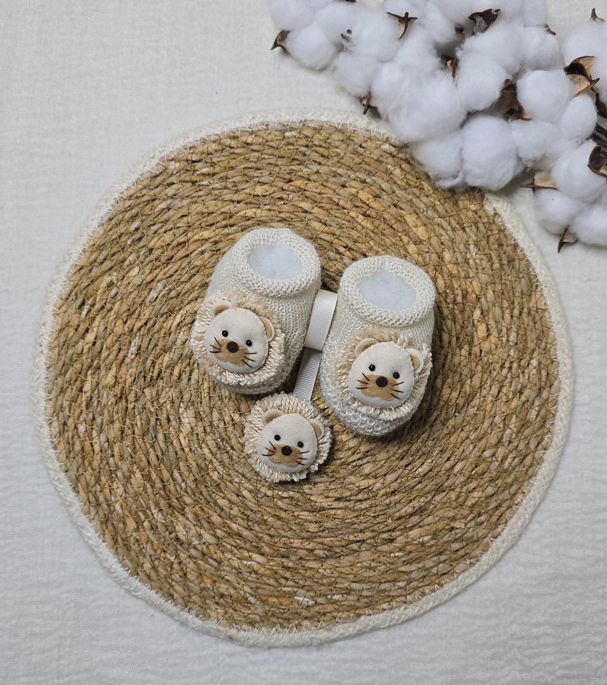 Botinha e Prendedor de Chupeta, pensado para os primeiros dias do bebê. Confortável, macio e delicado, respeita a sensibilidade da pele do recém-nascido e traz um toque de charme ao enxoval. Indicado para bebês de 0 a 2 meses.
