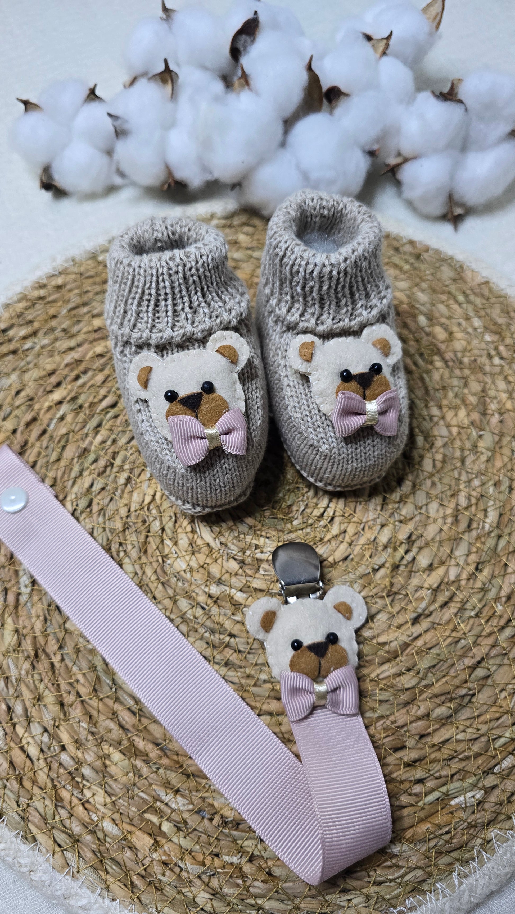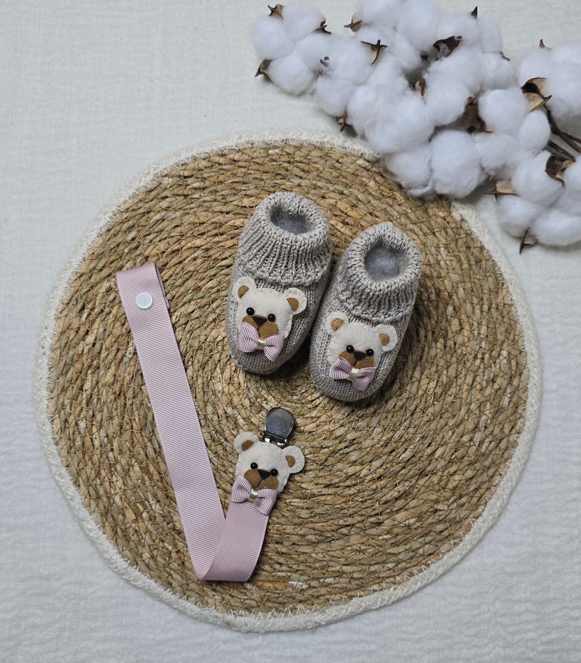 Botinha e Prendedor de chupeta, pensado para os primeiros dias do bebê. Confortável, macio e delicado, respeita a sensibilidade da pele do recém-nascido e traz um toque de charme ao enxoval. Indicado para bebês de 0 a 2 meses.