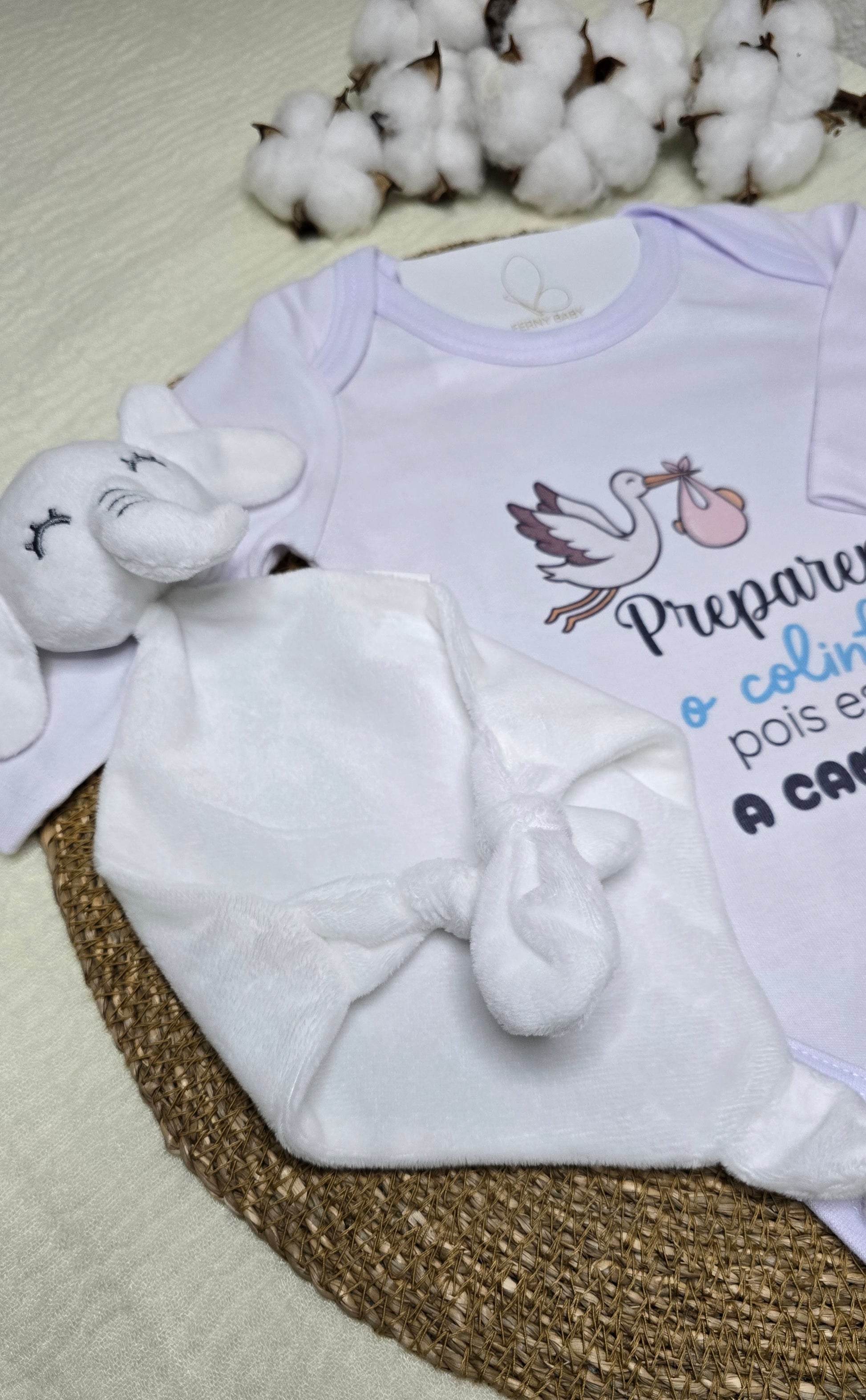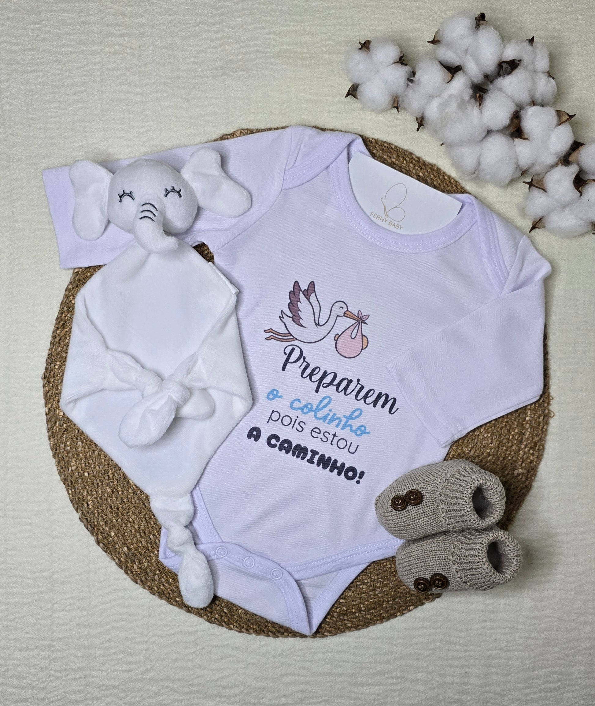 Acompanha sapatinho no mesmo tamanho e uma naninha de elefantinho, macia e aconchegante, perfeita para envolver o bebê desde os primeiros dias de vida.
