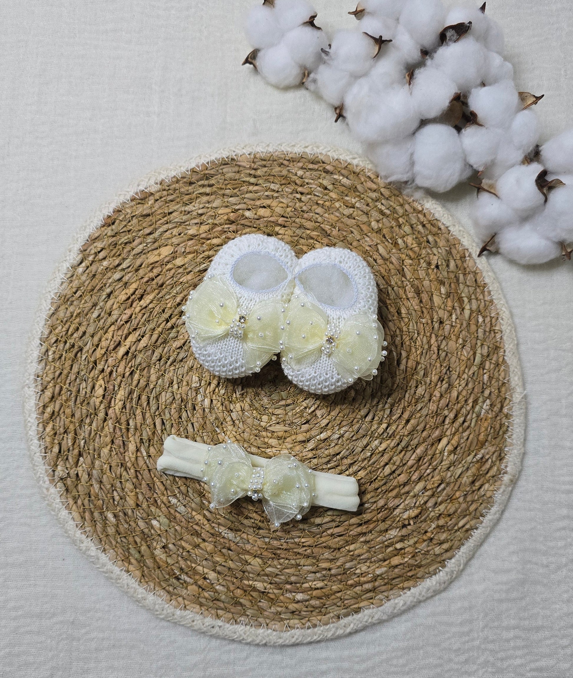Sapatinho e Tiara, pensado para os primeiros dias do bebê. Confortável, macio e delicado, respeita a sensibilidade da pele do recém-nascido e traz um toque de charme ao enxoval. Indicado para bebês de 0 a 2 meses.