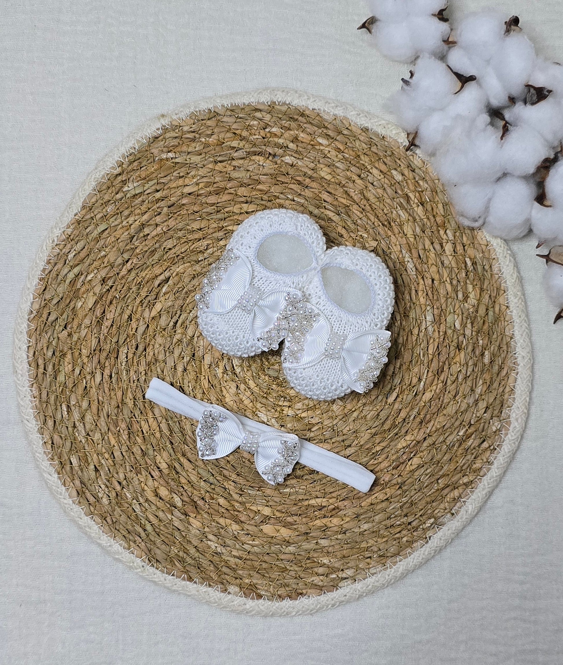 Conjunto de sapatinho e tiara, pensado para os primeiros dias do bebê. Confortável, macio e delicado, respeita a sensibilidade da pele do recém-nascido e traz um toque de charme ao enxoval. Indicado para bebês de 0 a 2 meses.