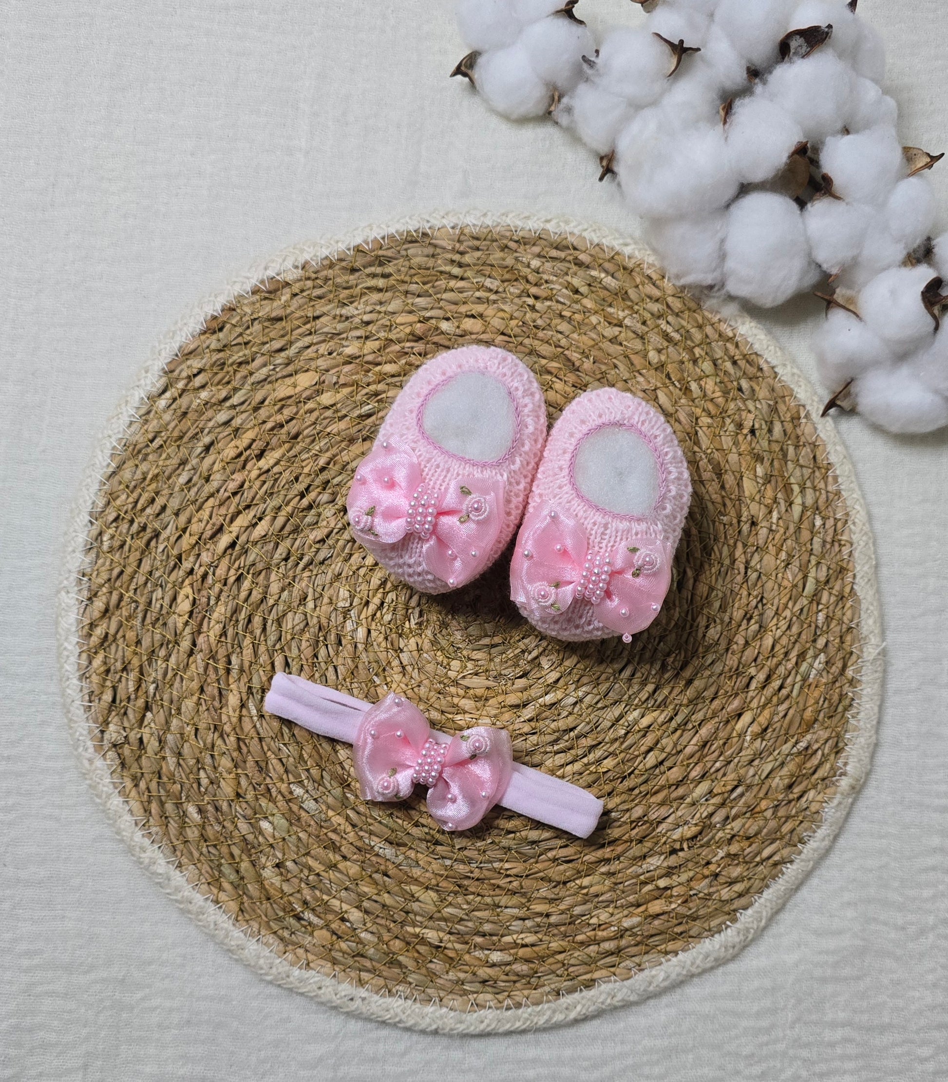 Sapatinho e Tiara, pensado para os primeiros dias do bebê. Confortável, macio e delicado, respeita a sensibilidade da pele do recém-nascido e traz um toque de charme ao enxoval. Indicado para bebês de 0 a 2 meses.