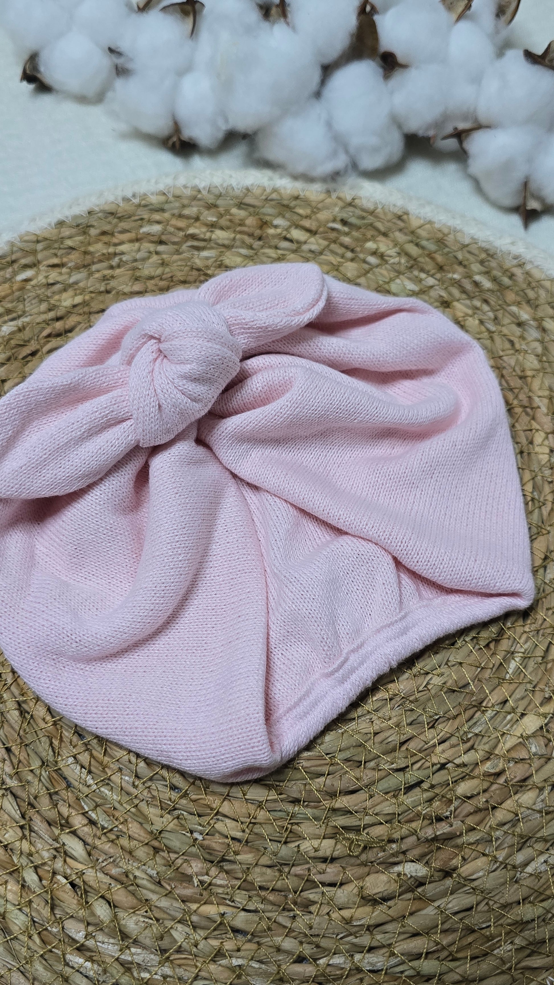 Turbante em tricô, desenvolvido especialmente para bebês de 0 a 2 meses.